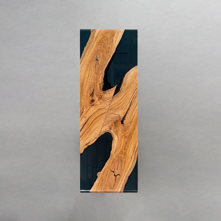 The tabletop features high-quality epoxy resin, expertly cast to create a mesmerizing ice crystal effect. This clear resin not only enhances the table’s strength and durability but also adds a touch of luxury and contemporary flair. The contrast between the warm, rich tones of the olive wood and the transparent resin creates a striking visual appeal that makes each piece truly unique.