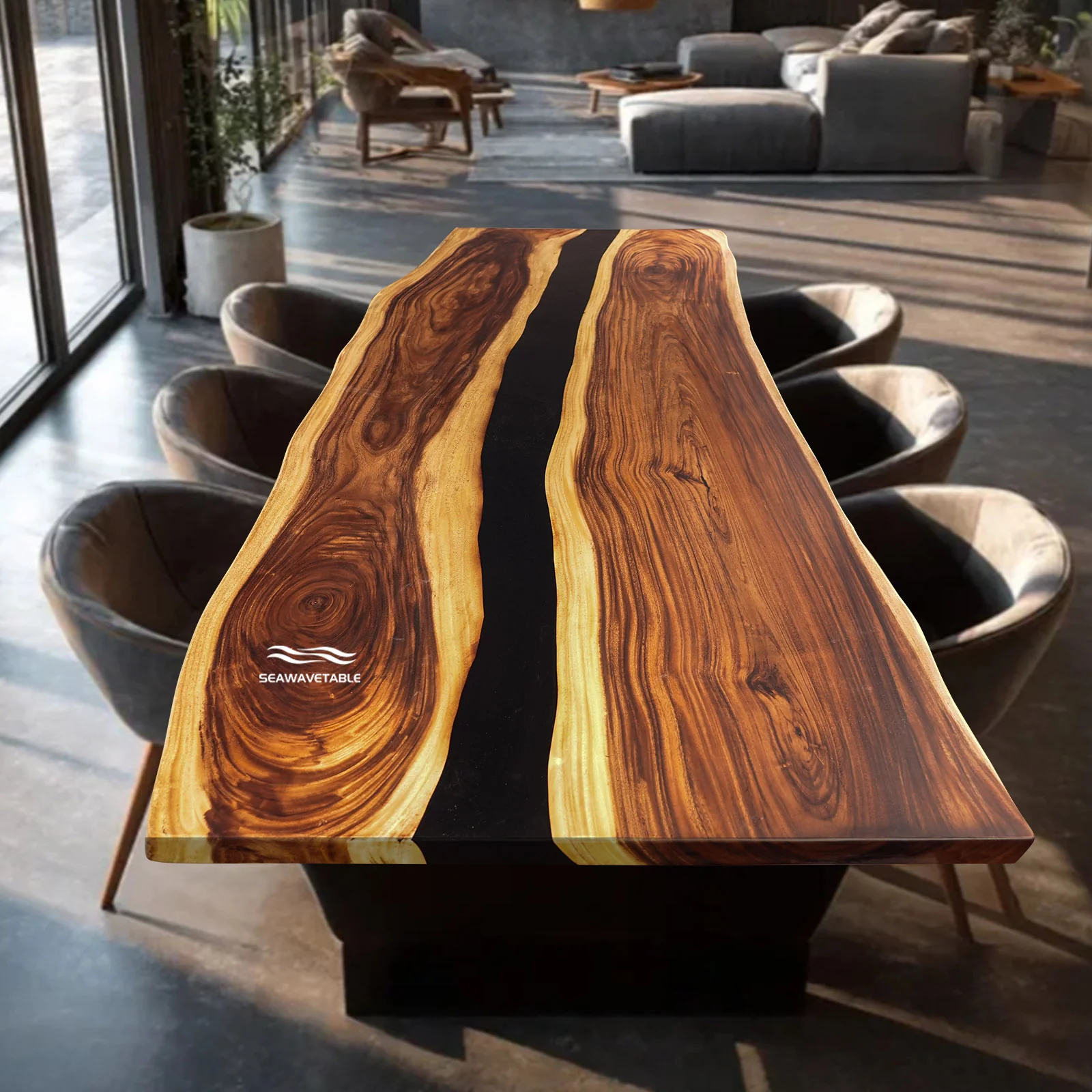 Each epoxy wood table is handcrafted with care, showcasing the rich grain patterns and deep tones of premium walnut. The live edge follows the natural shape of the tree, making every piece unique. The flowing epoxy river adds contrast and character, turning this wood epoxy table into a functional piece of art.