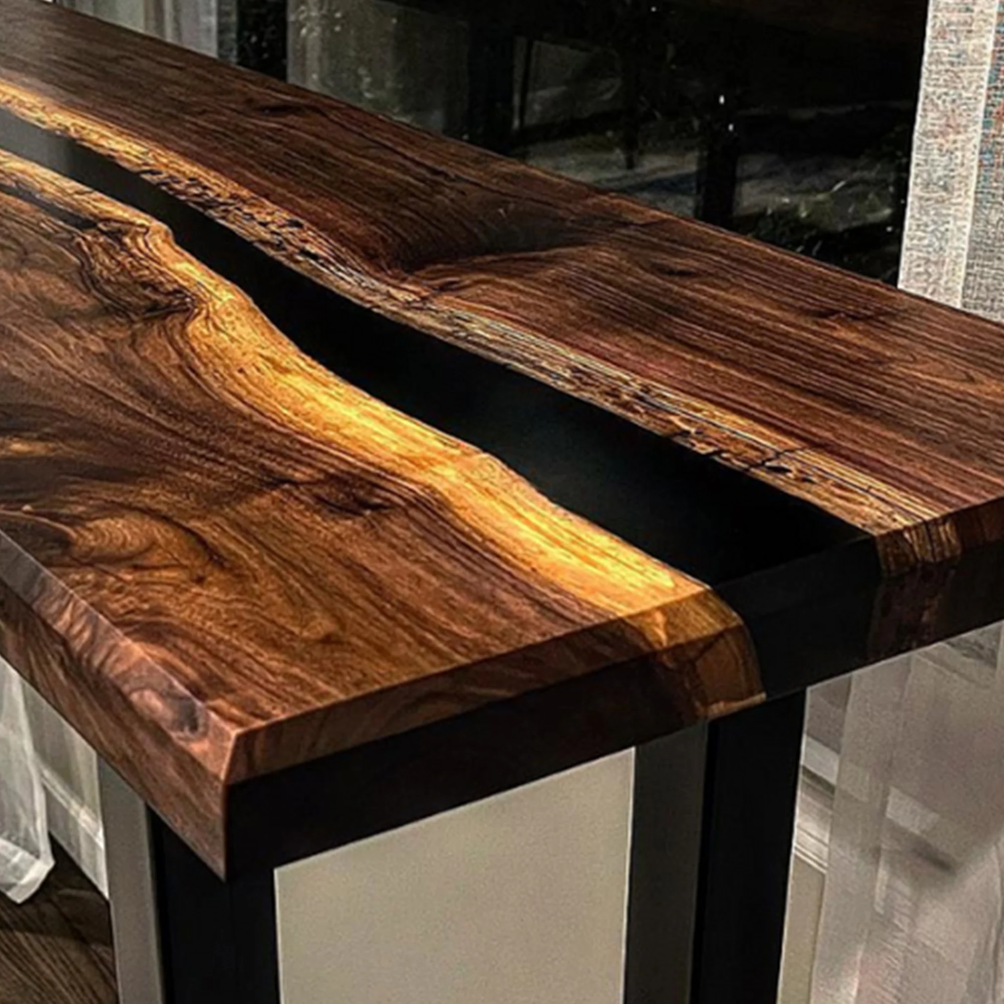 The Custom Black Epoxy Resin Console Table Top CRT-031 is a testament to the beauty of natural materials and expert craftsmanship. Whether used as a decorative piece or a functional table, it is sure to impress.