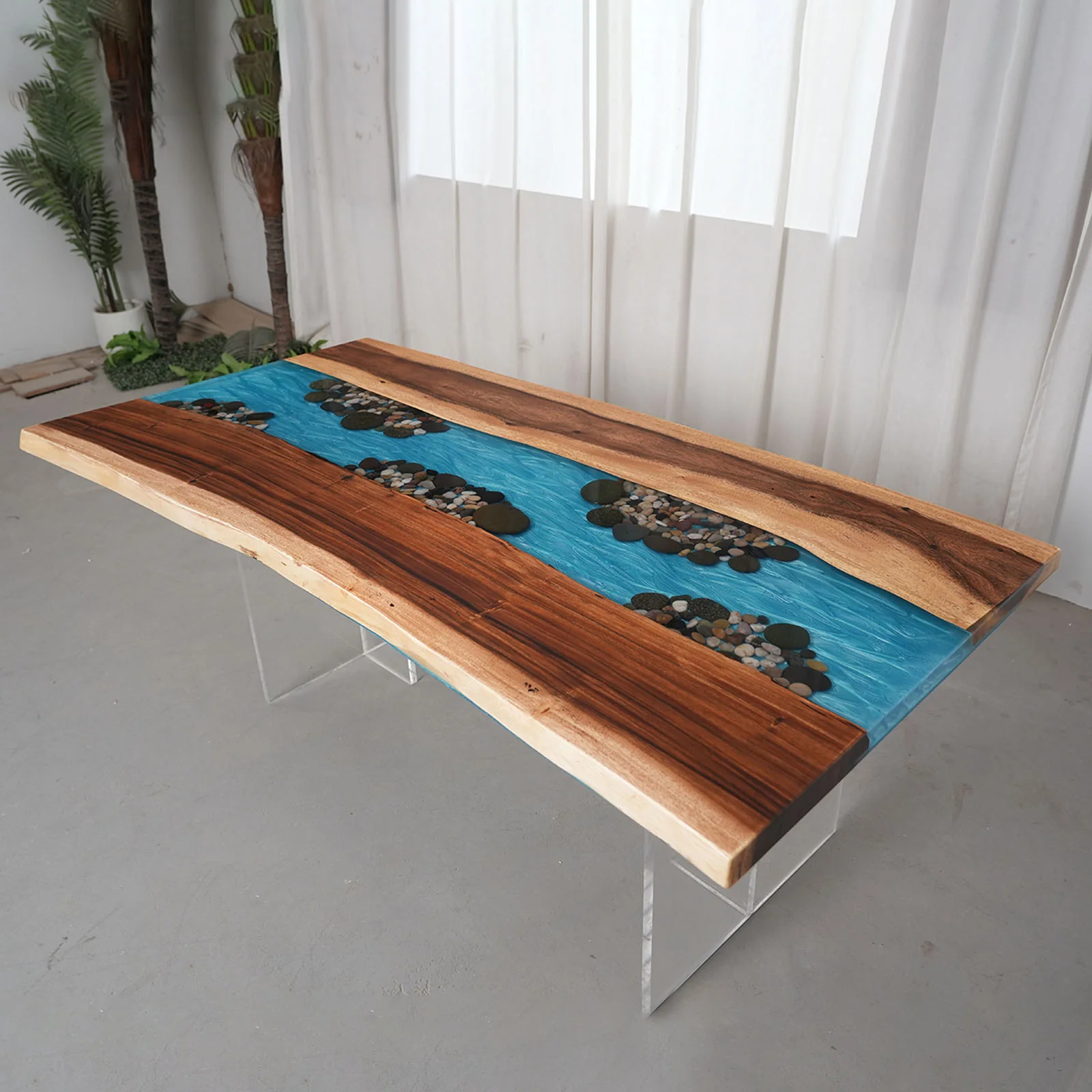 Each pebble is individually placed by hand, creating a natural, flowing river effect that brings movement and character to the tabletop. The smooth, polished resin surface seals the pebbles in place, ensuring durability while preserving a striking three-dimensional visual experience.