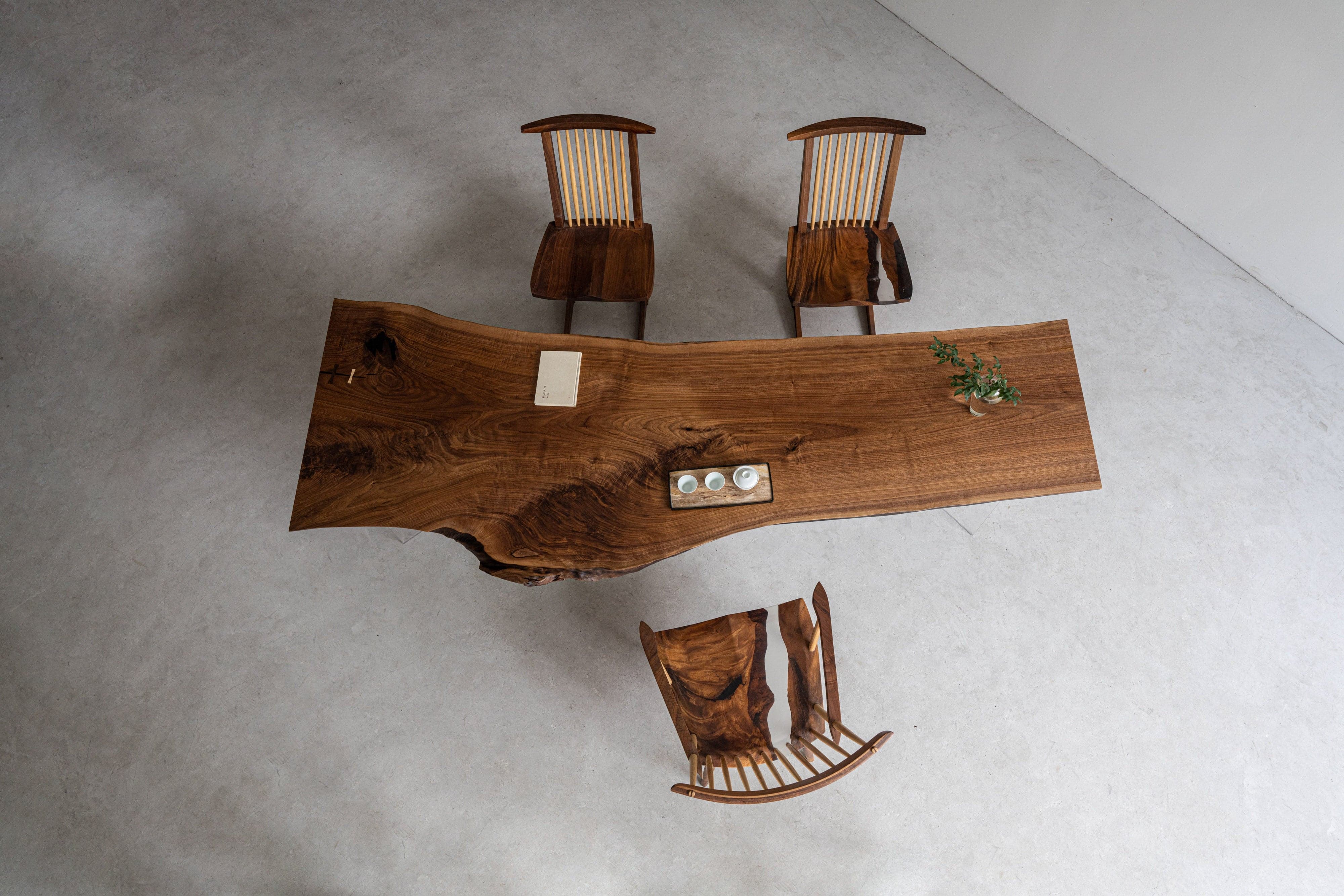 The Handmade Black Walnut Wood Slab Live Edge Table measures 107.87 inches in length, with a width that varies from 26.38 inches to 37.20 inches. This table features a single slab of black walnut wood, known for its deep, rich tones and beautiful grain patterns. The live edge design preserves the natural contours of the wood, highlighting its unique characteristics and organic beauty. Each edge retains the natural shape of the tree, making every table a one-of-a-kind piece. This handmade table is perfect for use in a dining room or as a conference table, providing a striking and functional centerpiece that blends rustic charm with modern elegance. The generous size and natural aesthetics make it ideal for creating an inviting and stylish space for gatherings and meetings.
