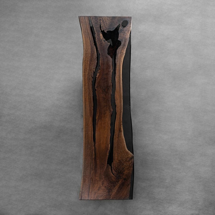 The Black Walnut Wood Live Edge Resin Conference Room Table measures 143.54 inches in length, with a width ranging from 34.84 inches to 41.54 inches. This table is crafted from a single slab of black walnut wood, renowned for its rich, dark tones and distinctive grain patterns. The live edge design preserves the natural contours and organic beauty of the wood, adding a rustic and unique charm to the table. The table features epoxy resin inlays, which can be clear or tinted, enhancing the wood's natural beauty and providing a smooth, durable surface. The expansive size of the table makes it ideal for conference rooms, offering ample space for meetings and discussions. The combination of luxurious black walnut wood and resin creates a stunning and sophisticated centerpiece, perfect for adding elegance and a touch of nature to any professional environment. This table not only serves a functional purpose but also stands out as a statement piece, showcasing the beauty of natural wood and modern design.