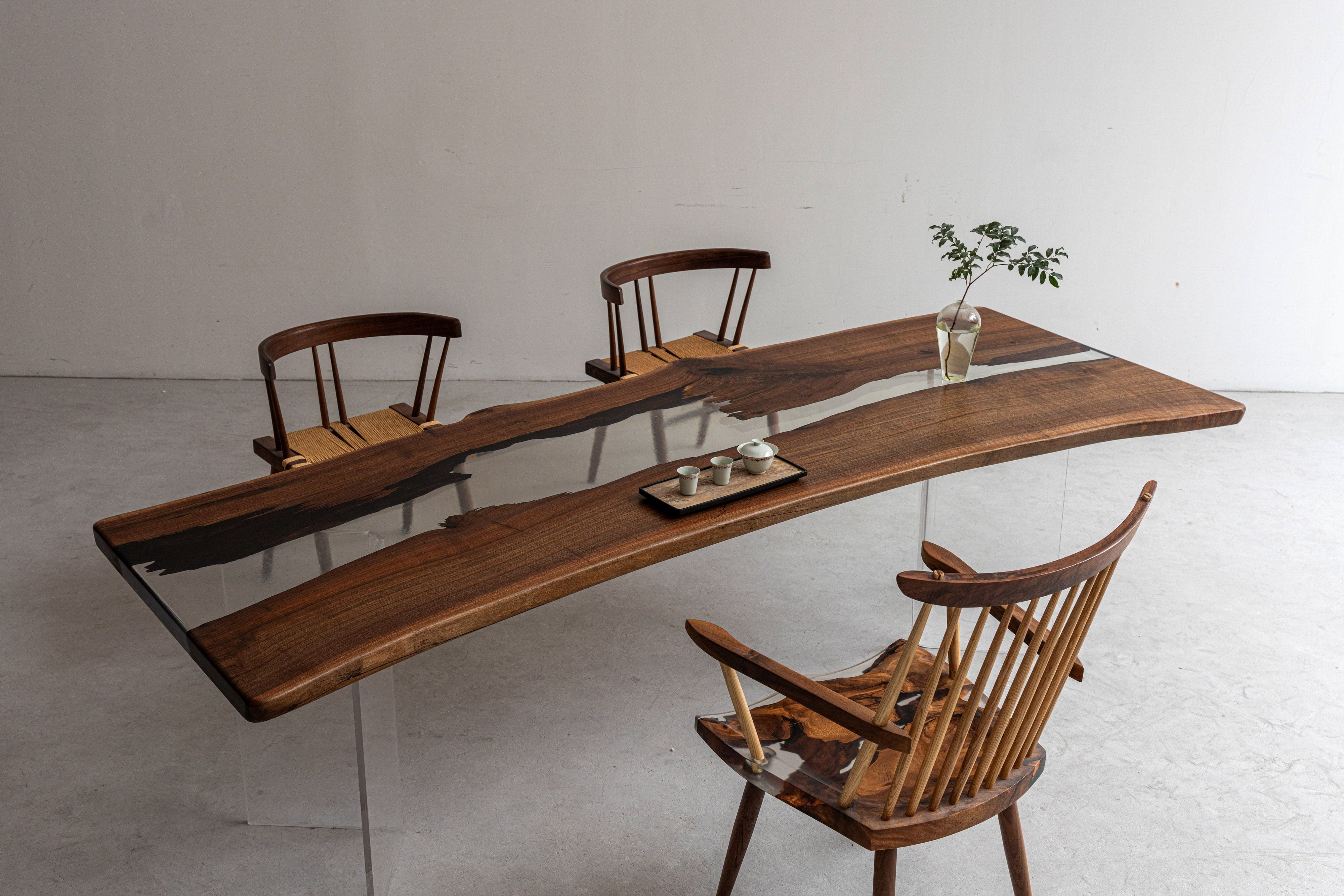The Black Walnut Live Edge Ice Crystals Epoxy Dining Room Table measures 97.83 inches in length and 33.86 inches in width. This remarkable dining table features a slab of black walnut wood, known for its deep, rich tones and stunning grain patterns. The live edge design preserves the natural contours of the wood, adding a rustic and organic charm to the piece. The table is enhanced with a unique epoxy resin inlay featuring "ice crystals," creating a captivating visual effect that mimics the appearance of frozen water. This resin inlay not only highlights the wood's natural beauty but also adds a modern, artistic touch to the design. The combination of luxurious black walnut wood and the intricate ice crystal epoxy makes this table a striking centerpiece for any dining room, blending contemporary elegance with natural aesthetics. This table is perfect for those looking to create a sophisticated and visually appealing dining space.