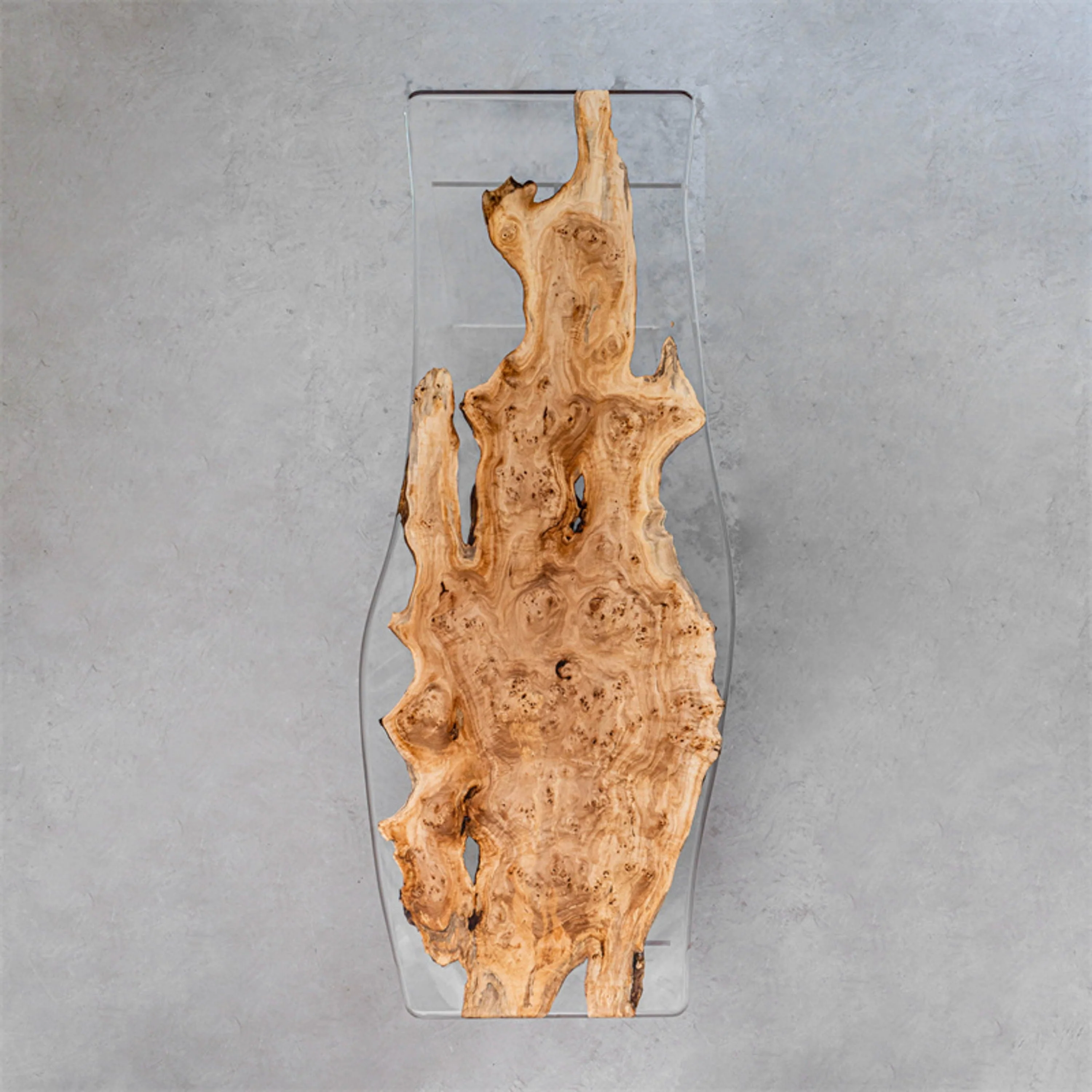The Poplar Live Edge Clear Epoxy Resin Table Top measures 106.22 inches in length and 31.89 inches in width. This table top features a beautiful slab of poplar wood, known for its light, creamy tones and unique grain patterns. The live edge design preserves the natural contours and character of the wood, adding an organic and rustic charm to the piece. The table top is complemented by a clear epoxy resin inlay, which enhances the natural beauty of the poplar wood while providing a smooth and durable surface. The clear resin allows the intricate details of the wood to be fully appreciated, creating a stunning visual effect. This table top is perfect for creating a unique and elegant dining table, desk, or accent piece, offering a blend of natural beauty and contemporary style. The combination of the live edge poplar wood and clear epoxy resin makes this table top a captivating centerpiece, ideal for enhancing the aesthetic appeal of any space.