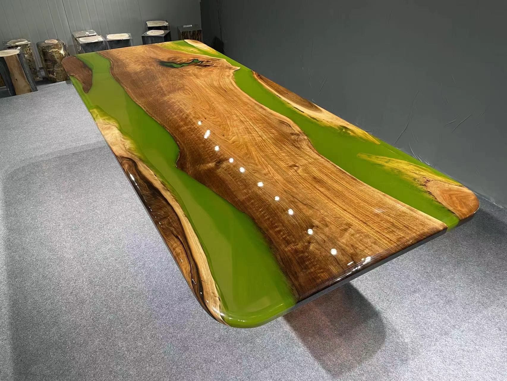 SEAWAVETABLE Walnut Wood Live Edge Epoxy Resin Dining Table, a stunning centerpiece for your dining area. Measuring 122.05"L x 51.18"W, this table features a live edge walnut wood top combined with a beautifully crafted epoxy resin river, creating a unique and eye-catching design. The natural beauty of the walnut wood, with its rich grain and live edge, is perfectly complemented by the glossy, smooth resin, making each table a one-of-a-kind masterpiece. Elevate your dining experience with this exquisite blend of nature and artistry.