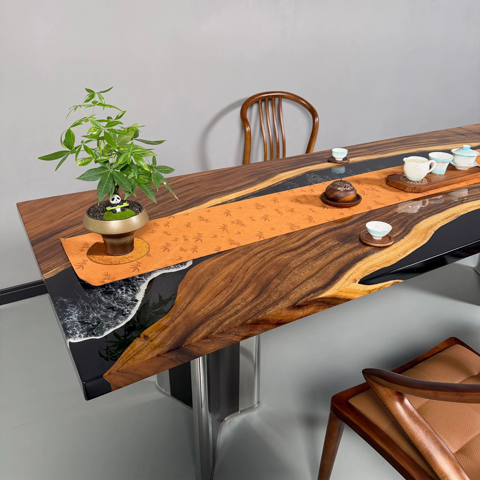 Walnut River Table 101.6″ × 36″ – Black Resin with White Ocean Waves, High-Gloss Straight Edge